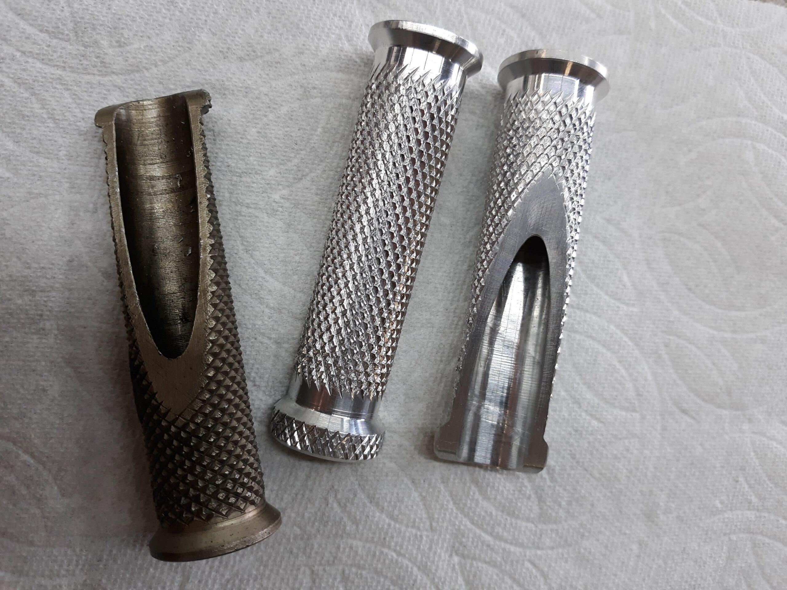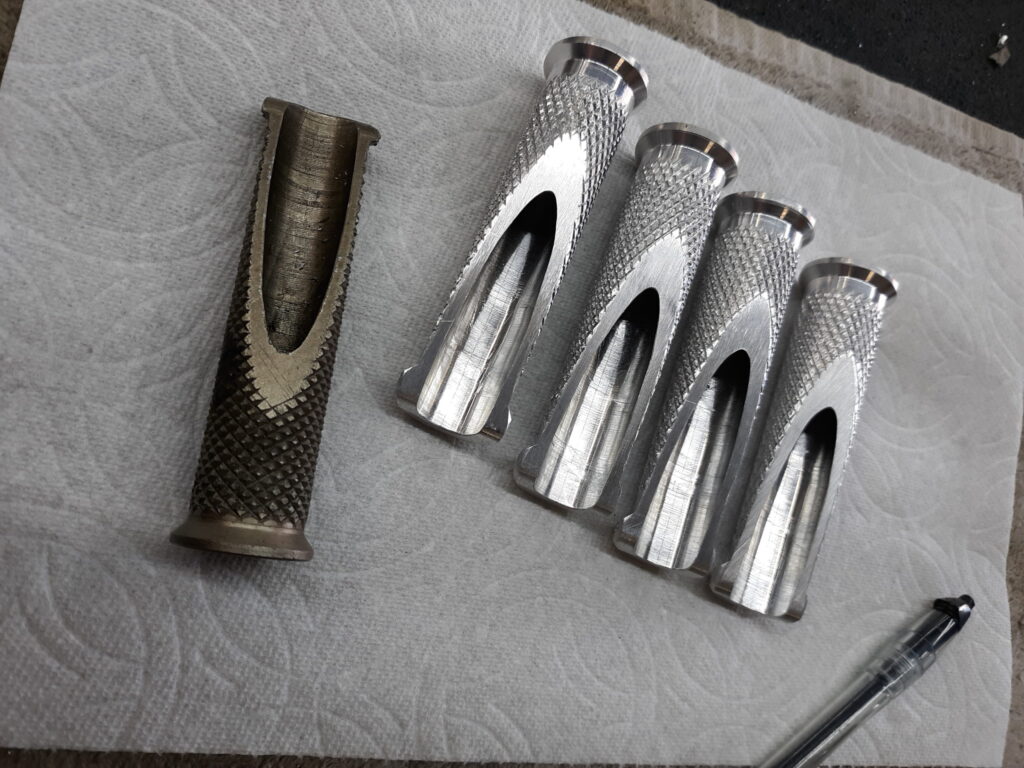 This next photos shows some footpegs that I made. These were quite tricky to make with the changing diameters and that angle cut. And knurling always involves some trial-and-error and a bit of luck. But I was pleased with how they turned out, and the customer was ecstatic. (The dark footpeg is an original.)
