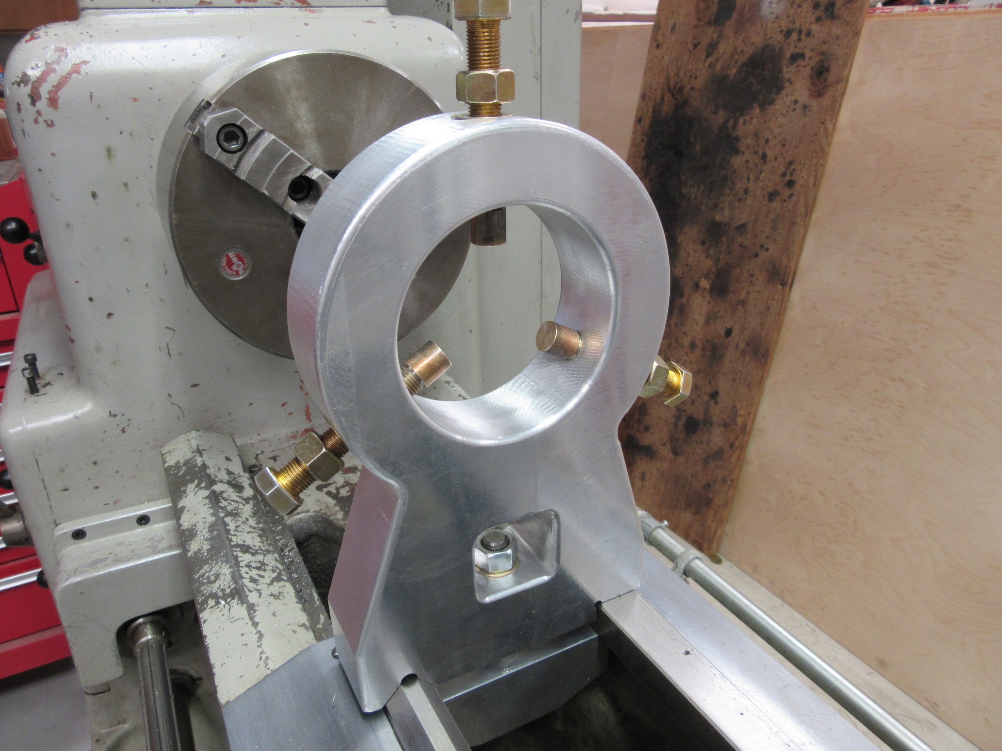 It was pretty simple to make; just a plate of 1-1/2” thick aluminum plate that I had laying around the shop, shaped on my vertical mill. The three bolts are used to center the material so that it runs true. Those pieces on the ends of the bolts are bearing bronze, which is pretty much self-lubricating. All it needs is a drop of oil every minute or so. I’ve used it several times, and I’m quite surprised at how well it works. Anyway, it was just just a fun little project…